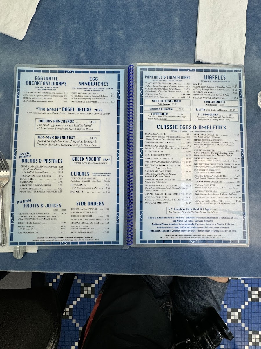 On the breakfast front, the diner shines bright with an array of egg sandwiches and wraps. Treat yourself to the Western Egg Sandwich for a hearty start at $9.25. The Egg White Breakfast Wraps come in tempting varieties like Anthony Quinn with tomato and feta, or the Denver featuring ham with peppers and onions, each priced at $8.95.